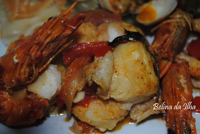 Deitei um fio de azeite na cataplana e coloquei os ingredientes por camadas começando pelas spring onions, seguido pelos alhos, a folha de louro e o tomate. Depois deitei as lulas e temperei de sal, açafrão, a piripiri, a salsa picada e o vinho. Tapei e levei ao lume médio durante 25 minutos. Entretanto deitei as ameijoas de molho em água e sal. Depois de deixar descansar um pouco abri a cataplana e deitei o miolo de camarão e as ameijoas escorridas. Envolvi com a ajuda de uma colher de celicone e tapei de novo. Levei mais 10 minutos ao lume. Antes de servi polvilhei com mais salsa picada.