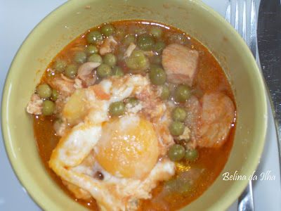 Adicionei o ramo de cheiro e as ervilhas e deixei cozer. Antes de servir abri um ovo de cada vez dentro do tacho para escalfar e servi.